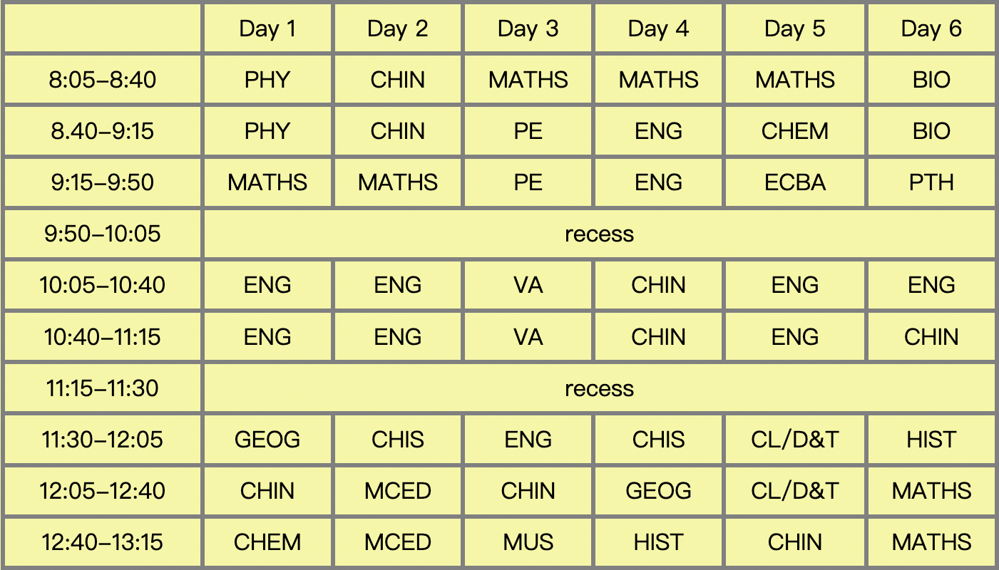 | 12:40-13:15 | CHEM | MCED | MUS | HIST | CHIN C/W | MATHS |
